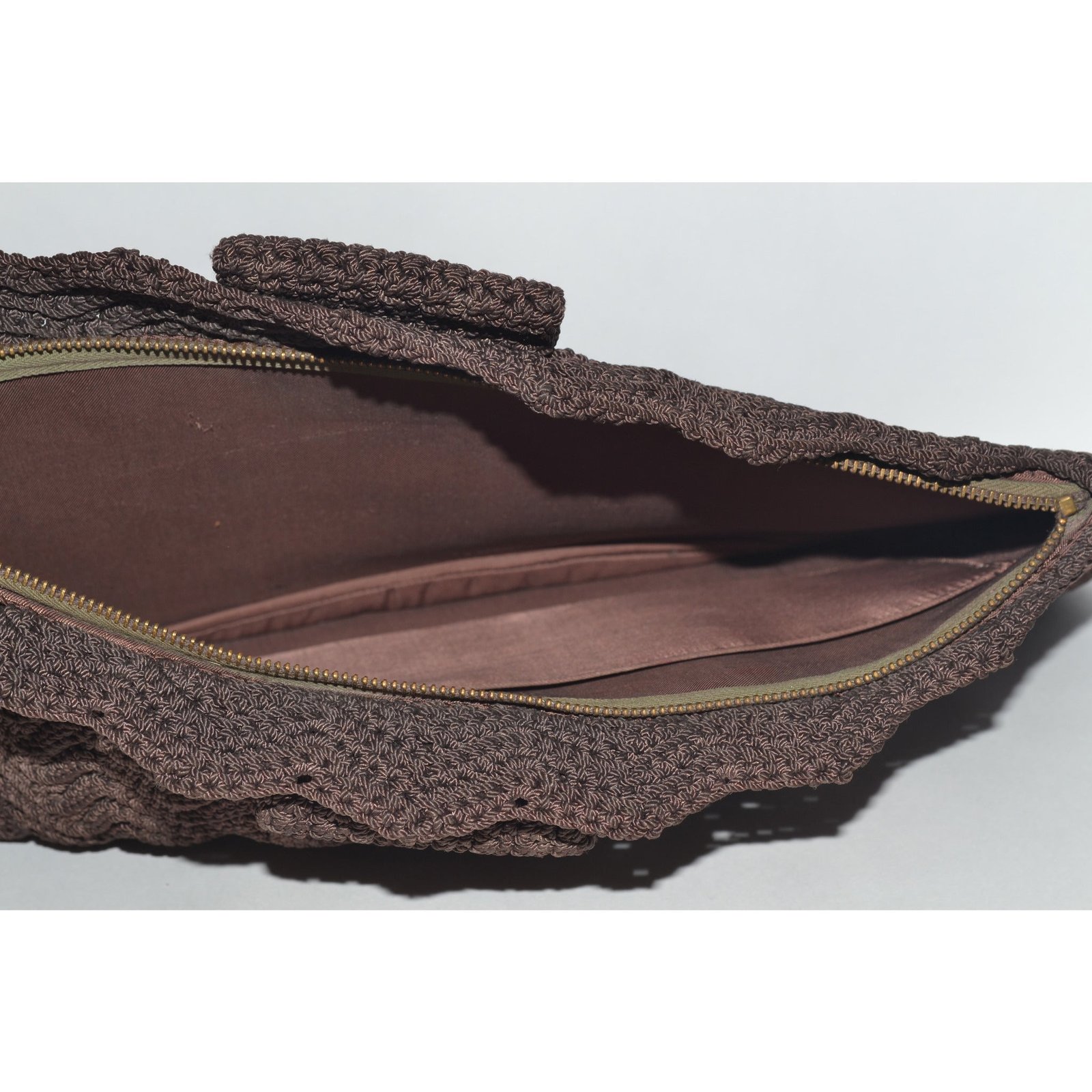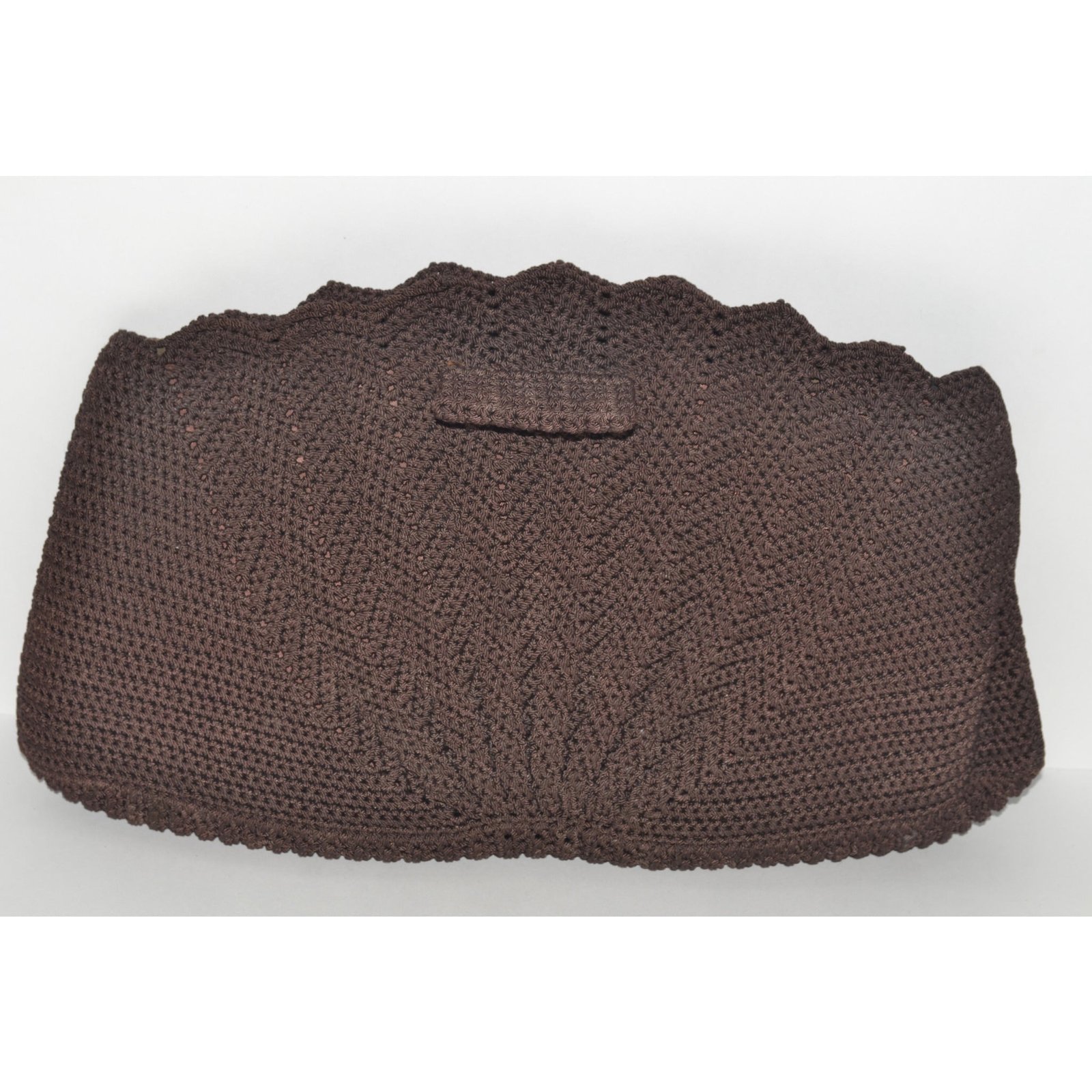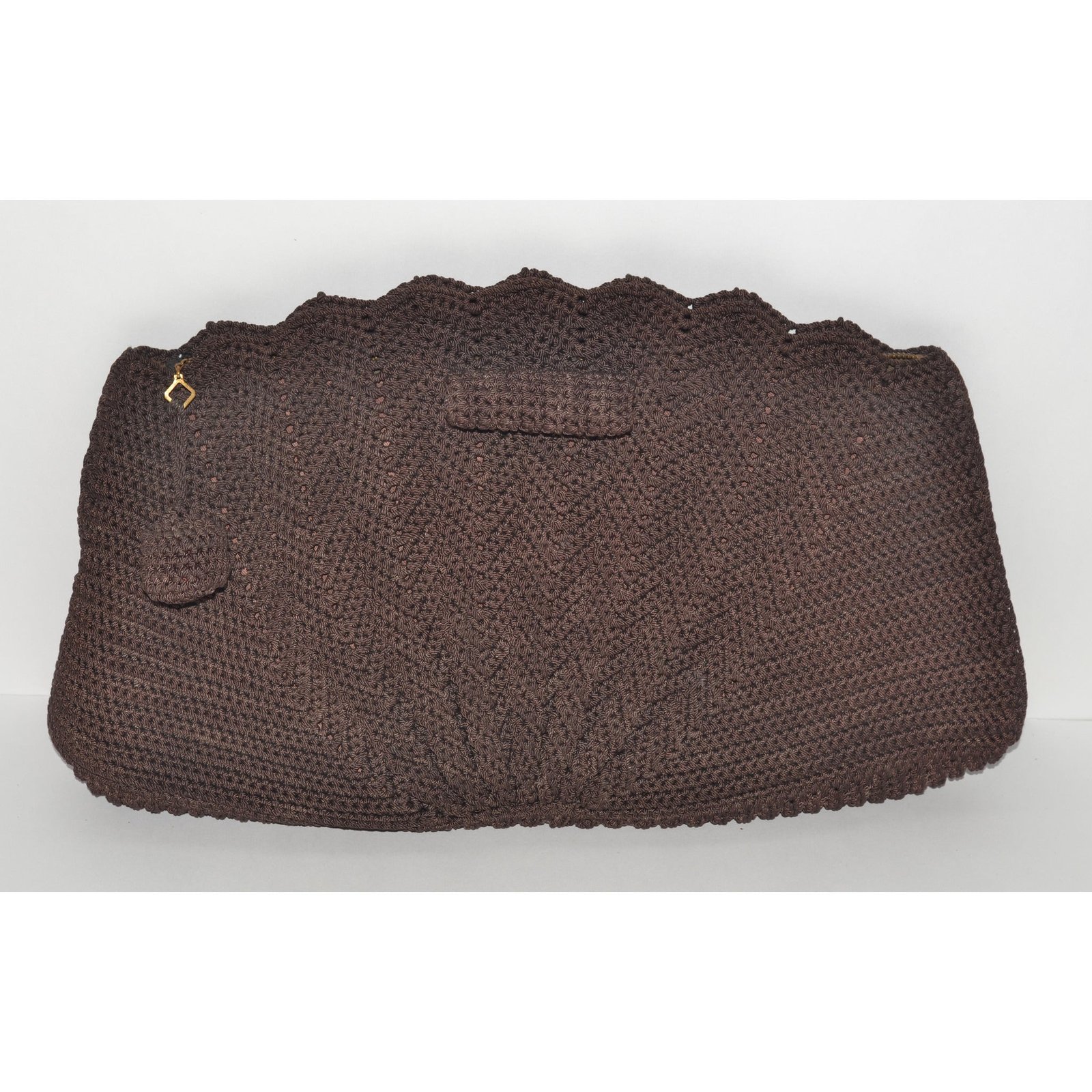 This 1940’s chocolate crocheted fan clutch purse has a pom-pom handle. Interior is fabric lined with one pocket.