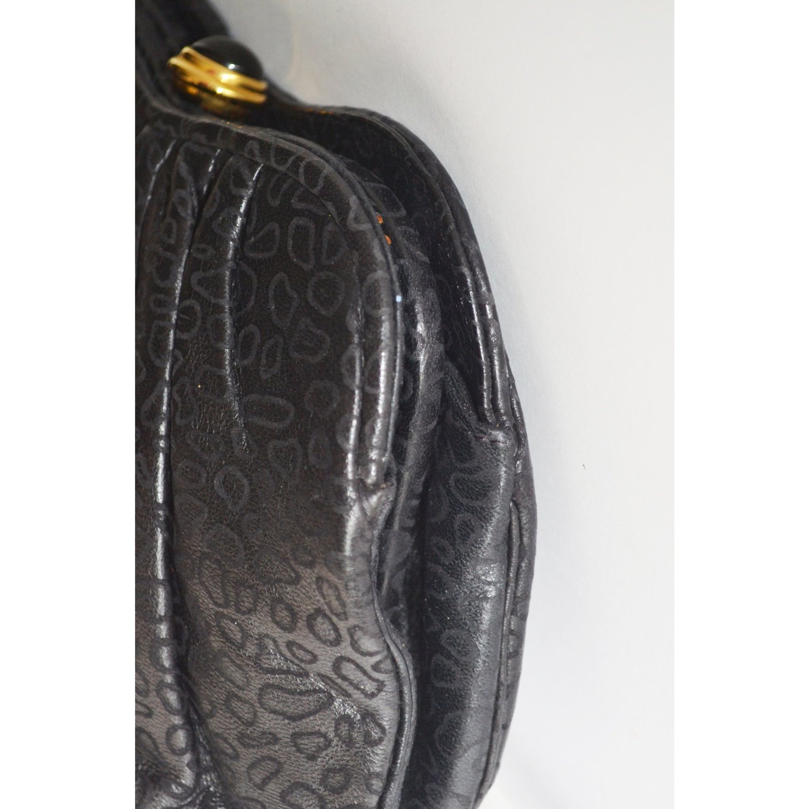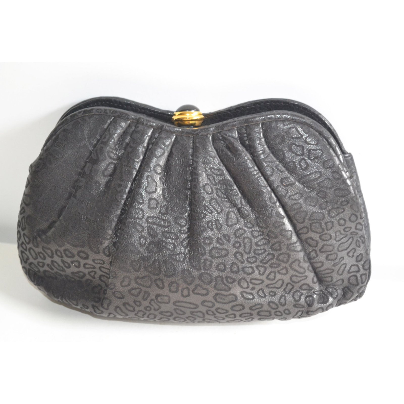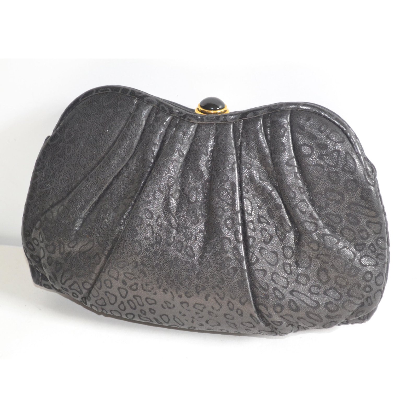 This embossed pleated black leather evening purse is from Tiras. Interior is fabric lined with two pockets (one zip). Has optional shoulder strap.