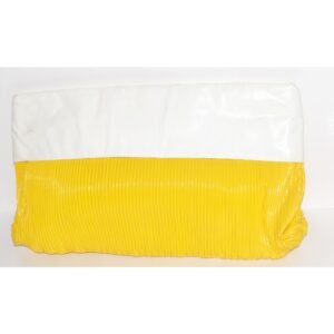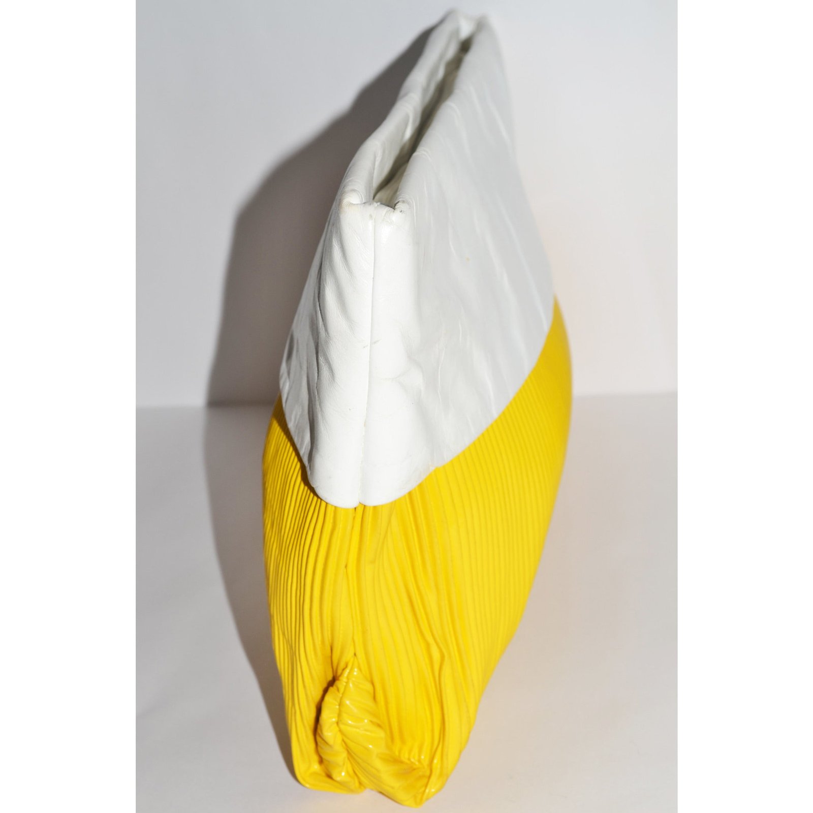 This vintage popping yellow & white ribbed clutch purse is made of vinyl and faux leather that folds over. Has one interior zip pocket.